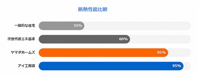 断熱性 断熱等級5、UA値0.6程度、C値1.0程度 断熱等級5、UA値0.4以下、C値0.5以下 アイ工務店