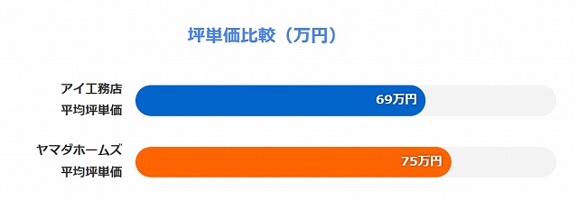 価格面で比較すると、アイ工務店の方がヤマダホームズよりも若干安い傾向にあります。アイ工務店の平均坪単価は69万円、ヤマダホームズは75万円と、約6万円の差があります。特に標準的な住宅を検討している方にとっては、この差は総額で200万円前後の違いになる可能性があり、予算を重視する方にはアイ工務店が優位と言えるでしょう。