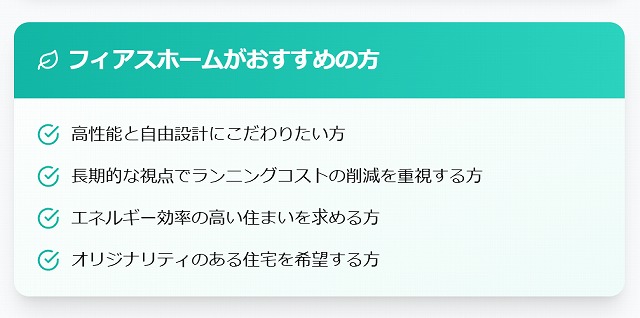 フィアスホームは、高性能住宅を求める方に適しています。断熱性能や耐震性能が高く、自由設計の幅が広いため、こだわりの住まいを実現したい方におすすめです。初期費用は比較的高めですが、長期的には光熱費などのランニングコストを抑えられる可能性があります。また、地域密着型のサービスにより、地域の特性に合わせたきめ細かい対応が期待できます。