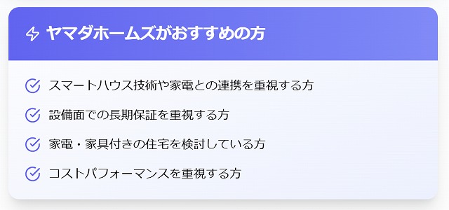 | 企業概要 | 大手家電量販店ヤマダデンキのグループ会社。家電との連携に強み。 | 「家は、性能。」をコンセプトに掲げる大手ハウスメーカー。 |