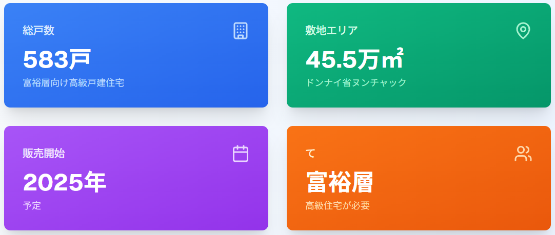 プロジェクトの規模は非常に大きく、ドンナイ省ヌンチャックに位置する45万4757平方メートルという広大な敷地に、主に富裕層をターゲットとした高級戸建住宅583戸を供給する計画となっています。この規模は、日本国内での一般的な住宅開発プロジェクトと比較しても相当な大きさであり、桧家グループの海外事業に対する本気度を示すものと言えるでしょう。販売開始は2025年を予定しており、既に具体的なスケジュールが組まれていることからも、プロジェクトの実現性の高さが伺えます。