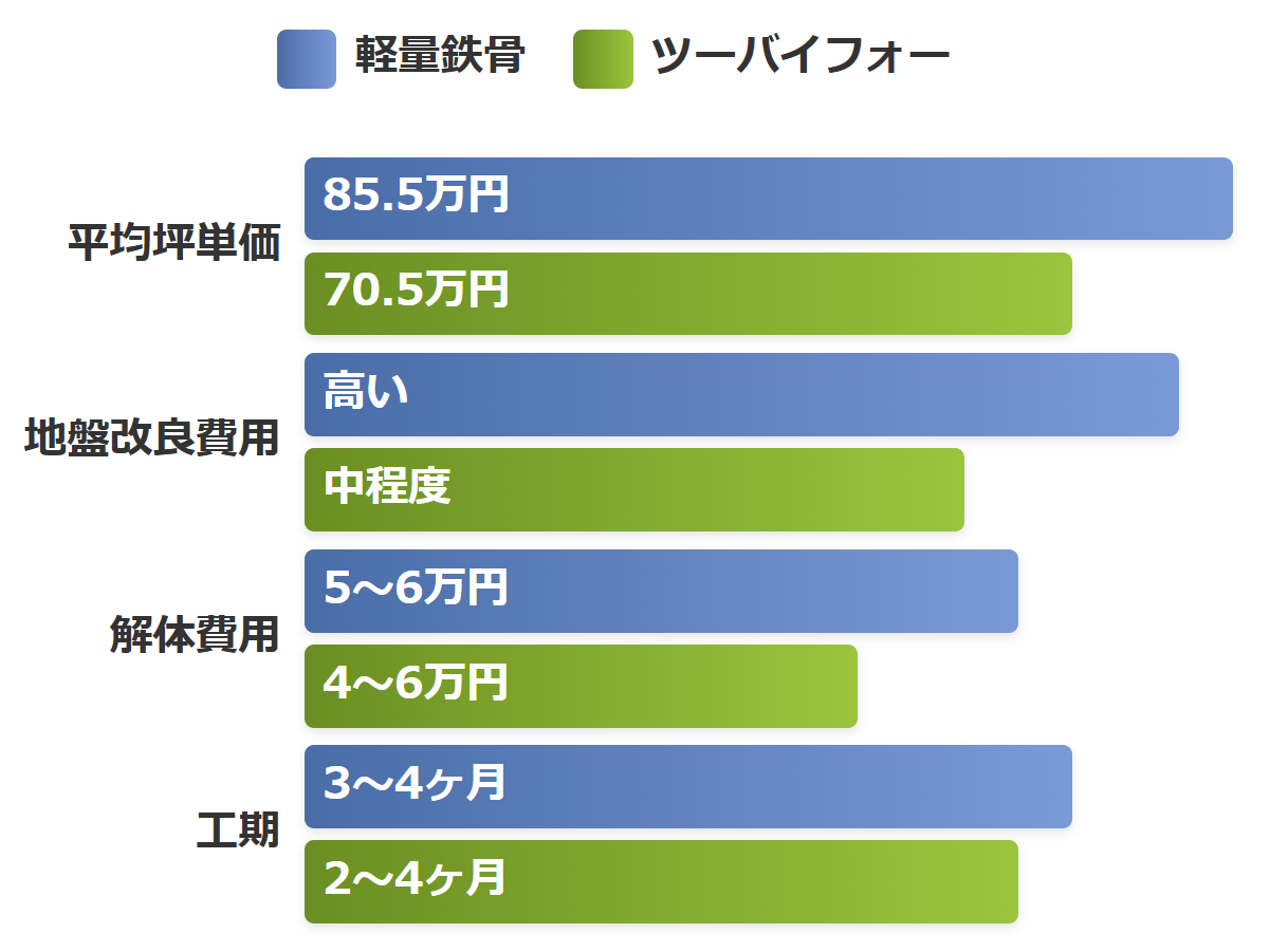 ツーバイフォーは木造であるため軽量鉄骨よりも軽量で、地盤改良費用を抑えられる傾向にあります。さらに、ツーバイフォー工法は部材が規格化されており、工場での生産効率が高いため、工期を短縮できるというメリットもあります。工期が短いということは、その分人件費を抑えられるということでもあります。将来的な解体費用も軽量鉄骨の方が若干高くなる傾向があり、ツーバイフォーは坪4~6万円程度であるのに対し、軽量鉄骨は坪5~6万円程度かかります。