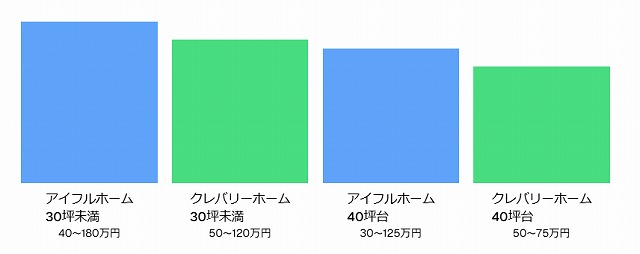 【PR】「クレバリーホーム」と「アイフルホーム」の比較 「クレバリーホーム」 比較 「アイフルホーム」注文住宅を検討する際、多くの選択肢の中から自分に合ったハウスメーカーを選ぶのは簡単ではありません。 今回は、人気の高い「クレバリーホーム」と「アイフルホーム」を徹底比較し、それぞれの特徴や強み、弱みを詳しく解説します。 この記事を参考に、あなたのライフスタイルや予算に合ったハウスメーカー選びの一助となれば幸いです。会社の特徴比較項目アイフルホームクレバリーホーム運営会社株式会社LIXIL住宅研究所株式会社新昭和経営形態フランチャイズシステム(業界初)フランチャイズシステムコンセプト「こどもにやさしいは、みんなにやさしい」「タイル貼りの家」強みLIXILの高品質な住宅設備を標準採用キッズデザインが標準仕様ハウスメーカーと工務店のいいところどり外壁タイルを標準仕様で採用メンテナンスコストの低減プレミアム・ハイブリッド構法による高い耐震性特徴的な設備LIXILのシステムキッチン、バスルーム、洗面化粧台など外壁タイル、シアスミン・エアー(空気環境改善)、シアスミン・ウォーター(ウルトラファインバブル水)受賞歴10年連続キッズデザイン賞受賞ジャパン・レジリエンス・アワード最優秀賞(台風対策パッケージ)特徴の比較ポイントアイフルホームは、LIXILグループの強みを活かした住宅設備と子ども目線のキッズデザインが特徴です。クレバリーホームは、外壁タイルを標準仕様とし、メンテナンスコストの低減と美しい外観の両立を実現しています。両社ともフランチャイズシステムを採用しており、ハウスメーカーの商品力と地域工務店の対応力を兼ね備えています。総評:特徴アイフルホームとクレバリーホームは、それぞれ異なる強みを持つハウスメーカーです。アイフルホームはLIXILグループの強みを活かし、高品質な住宅設備を標準採用しています。また、「こどもにやさしいは、みんなにやさしい」というコンセプトのもと、キッズデザインに力を入れており、10年連続でキッズデザイン賞を受賞しています。子育て世帯にとって安全で使いやすい住環境を提供する点が大きな魅力です。一方、クレバリーホームは「タイル貼りの家」をコンセプトに、外壁タイルを標準仕様として採用しています。タイルは耐久性が高く、メンテナンスコストを大幅に削減できるため、長期的な視点で見ると経済的です。また、プレミアム・ハイブリッド構法による高い耐震性や、空気環境や水質にまでこだわった健康志向の住宅設備も特徴的です。 両社ともフランチャイズシステムを採用しており、ハウスメーカーの商品力と地域工務店の対応力を兼ね備えている点は共通しています。子育て世帯で安全性と使いやすさを重視するならアイフルホーム、長期居住を見据えてメンテナンスコストの低減と健康的な住環境を重視するならクレバリーホームがおすすめです。総合的に見ると、長期的な視点での住まいづくりという点でクレバリーホームがやや優位と言えるでしょう。「クレバリーホーム」と「アイフルホーム」の見積もりが欲しい方はコチラから!!【無料】【PR】 タウンライフ価格・坪単価坪数アイフルホームクレバリーホーム30坪未満40万〜180万円50万〜120万円30坪台35万〜170万円50万〜100万円40坪台30万〜125万円50万〜75万円50坪台20万〜100万円50万〜80万円平均坪単価約64.6万円(30〜40坪台)約68.4万円(30〜40坪台)建築価格目安(30坪)1,050万〜5,000万円1,500万〜3,000万円坪単価の比較グラフ価格の比較ポイント30〜40坪台の平均坪単価は、アイフルホームが約64.6万円、クレバリーホームが約68.4万円と、アイフルホームの方がやや安い傾向にありますアイフルホームは価格帯の幅が広く、予算や要望に応じて選択肢が多いのが特徴ですクレバリーホームは最低坪単価が高めですが、外壁タイルが標準仕様のため、長期的なメンテナンスコストを考慮すると経済的です両社ともフランチャイズシステムを採用しており、中間マージンのカットによるコストダウンを実現しています総評:価格・坪単価価格面で比較すると、アイフルホームとクレバリーホームはそれぞれ異なる特徴を持っています。アイフルホームは30〜40坪台の平均坪単価が約64.6万円、クレバリーホームは約68.4万円と、初期費用ではアイフルホームの方がやや安い傾向にあります。また、アイフルホームは価格帯の幅が広く、20万円台から180万円台まで幅広い選択肢があるため、予算や要望に応じて柔軟に対応できる点が魅力です。 一方、クレバリーホームは最低坪単価が50万円程度と高めですが、外壁タイルが標準仕様となっているため、長期的なメンテナンスコストを考慮すると経済的です。一般的なサイディング外壁の場合、10〜15年ごとに100万円以上の塗装費用が発生しますが、タイル外壁はメンテナンス費用が大幅に削減できます。50年間のメンテナンスコストを比較すると、クレバリーホームの方が総コ